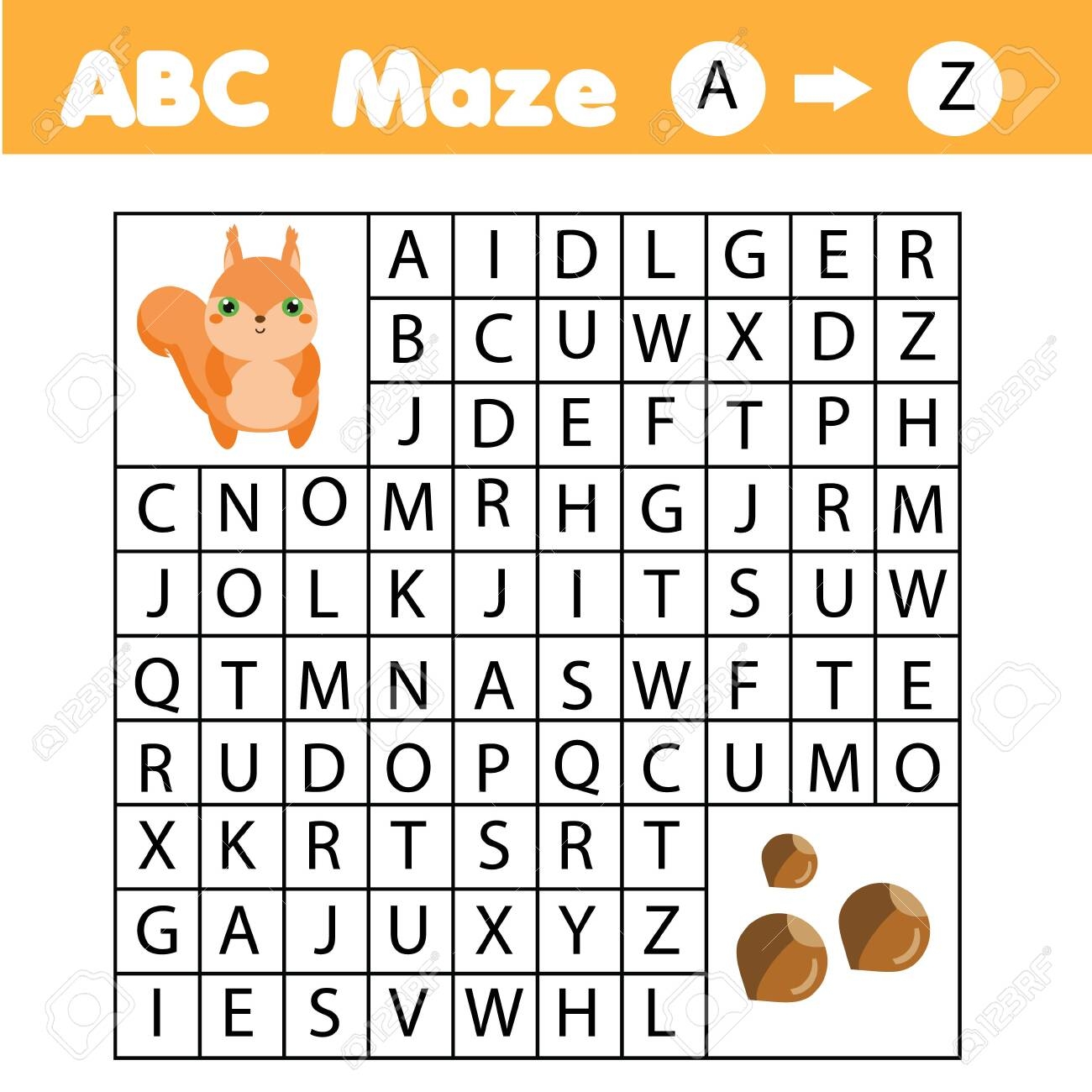 A To Z Maze Game For Children Help Squirrel Go Through Labyrinth Fun Page For Toddlers And Kids Learn English Alphabet Royalty Free SVG Cliparts Vectors And Stock Illustration Image 122279332