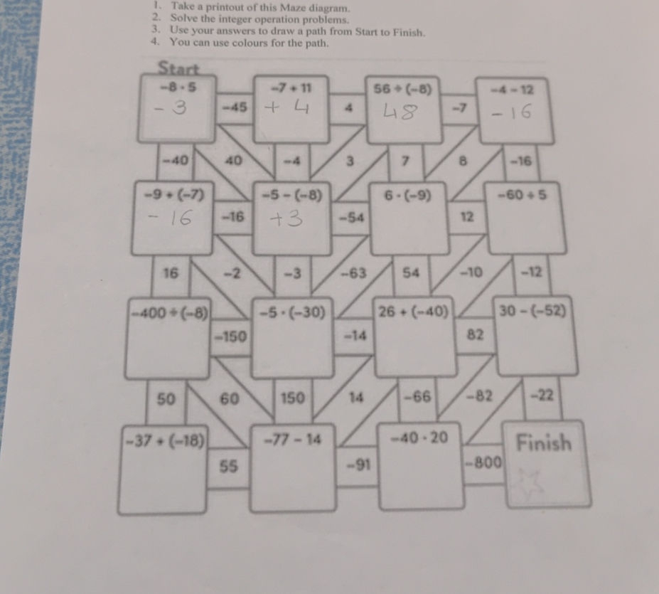 This maze worksheet is designed to challenge students to solve a series of integer addition and subtraction problems to find the correct path through the maze. Not only does it help reinforce their understanding of integers, but it also encourages critical thinking and problem-solving skills.