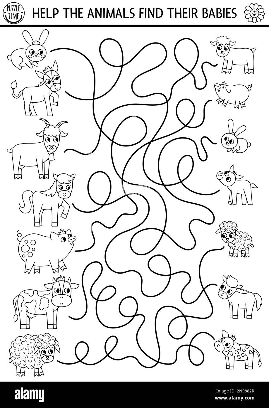 Black And White Farm Maze For Kids With Animals And Babies Country Side Line Preschool Printable Activity With Cute Goat Pig Cow Mothers Day Labyr Stock Vector Image U0026 Art Alamy