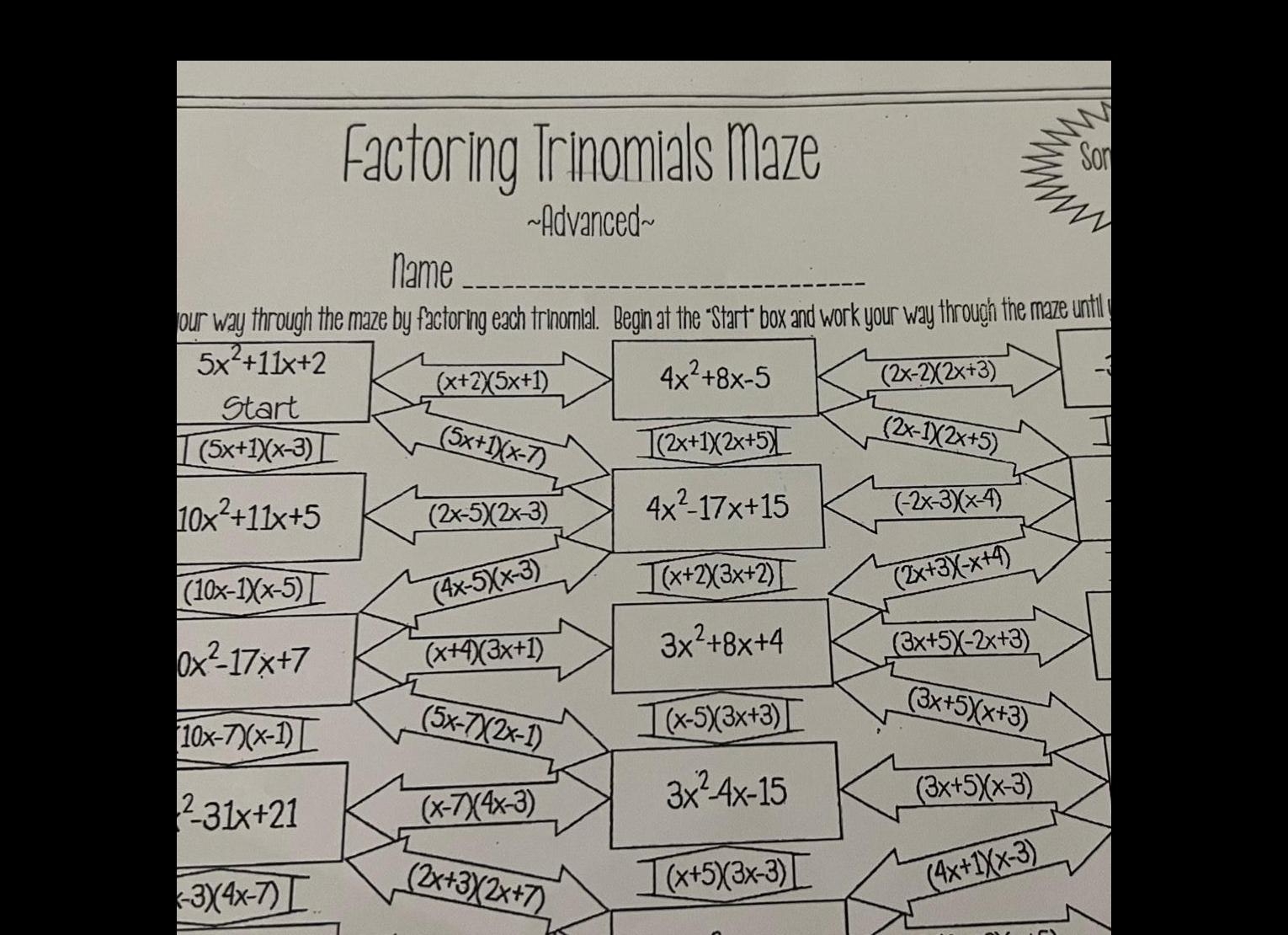 Factoring Maze Worksheet Key