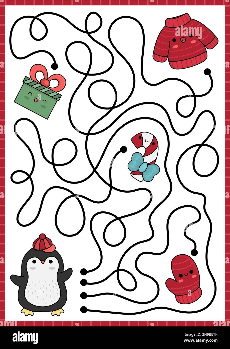 Christmas Maze For Kids Winter Holiday Preschool Printable Activity With Cute Kawaii Penguin Sweater Mitten Present Candy Cane New Year Labyrint Stock Vector Image U0026 Art Alamy