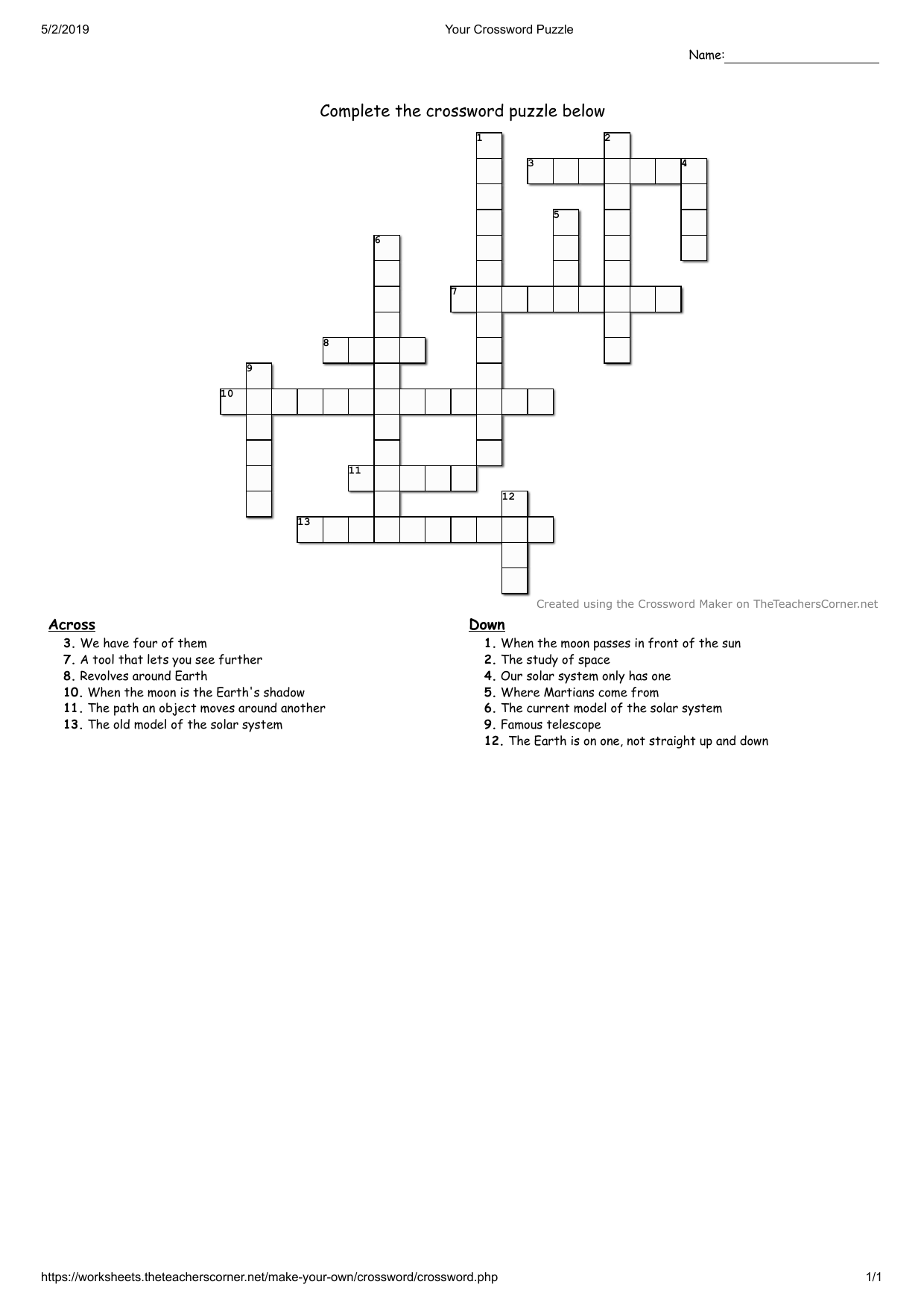 Space U0026 Astronomy Crossword Puzzle For Kids