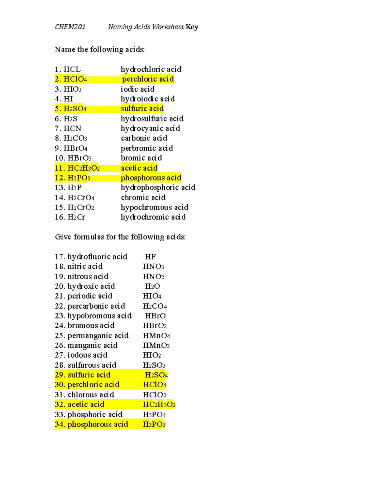 Naming Sheet Chem CHEM201 Naming Acids Worksheet Key Name The Following Acids HCL Hydrochloric Studocu