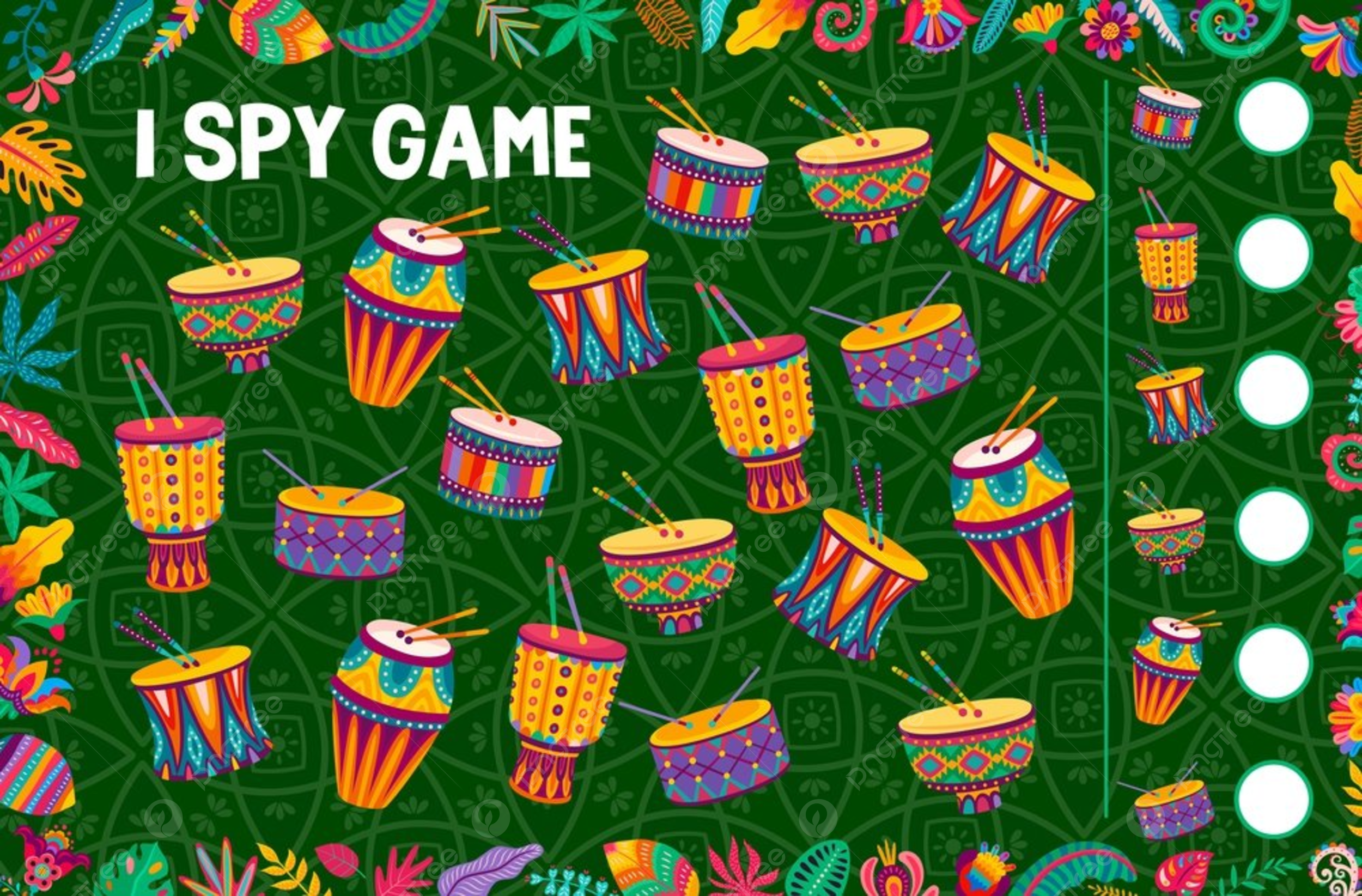 I Spy Game Worksheet Counting Of African Or Brazilian Drums Kids Vector Riddle Page With Cartoon