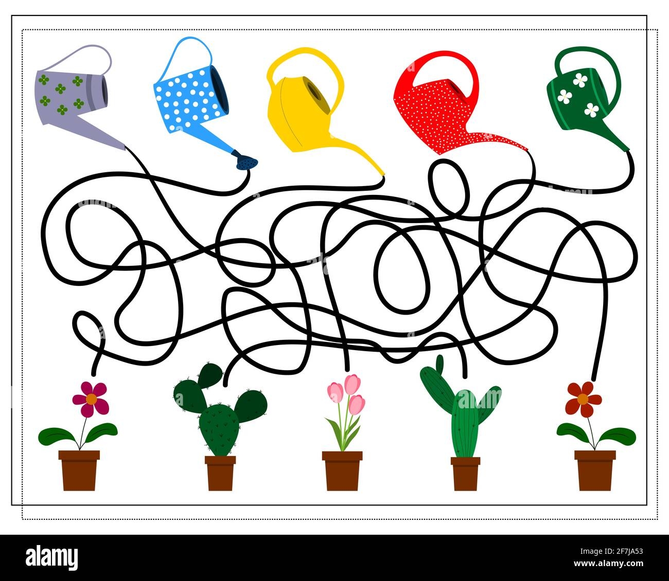 A Puzzle Game For Kids Go Through The Maze Which Watering Can That Pours Gardening Tools Potted Flowers Vector Stock Vector Image U0026 Art Alamy