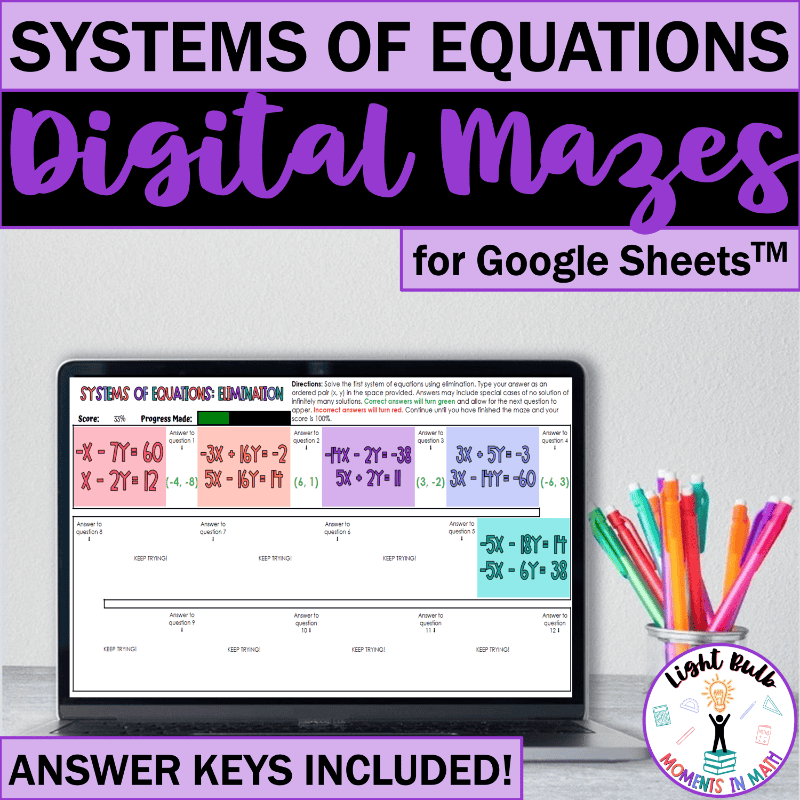 Systems Of Equations Digital Maze Activities For Google Sheets Light Bulb Moments In Math