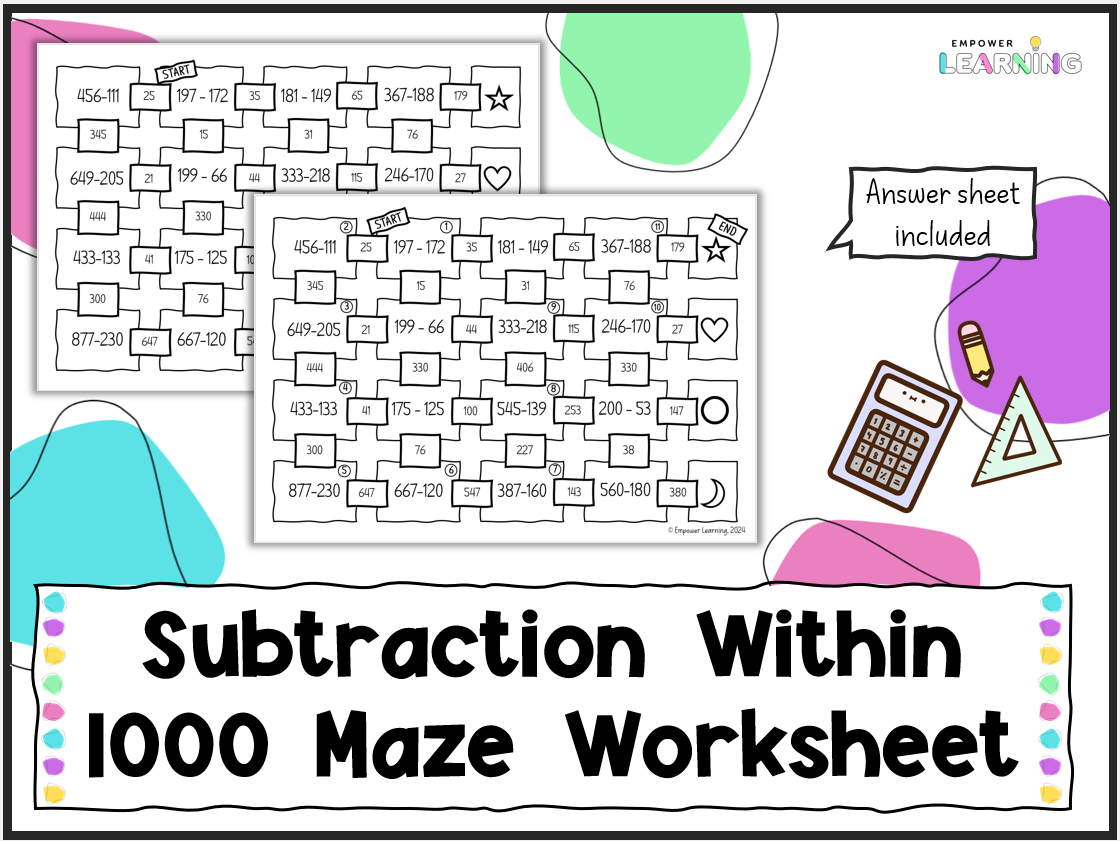 With vibrant graphics and a clear layout, the Worksheet Works Subtraction Maze is visually appealing and easy to follow. Kids will be drawn to the colorful design and engaging format, making math practice a fun and positive experience.